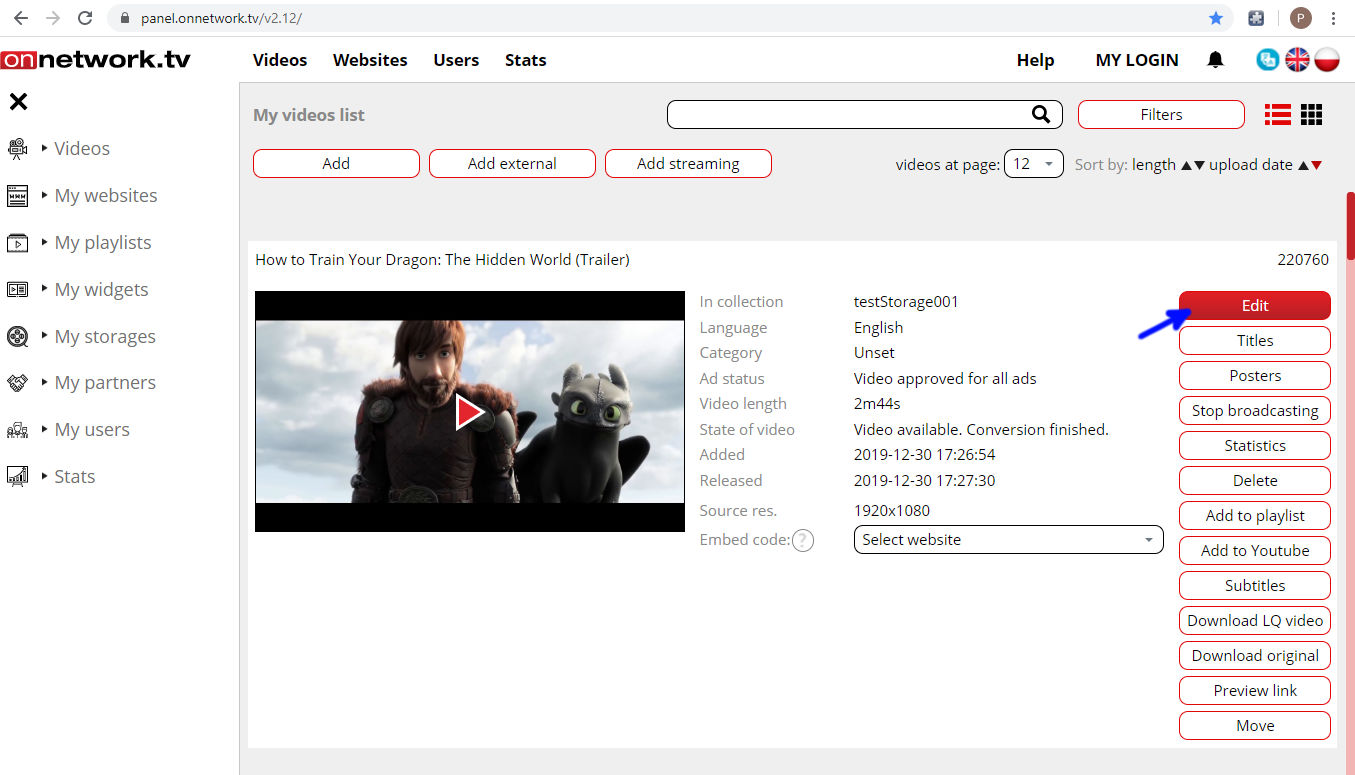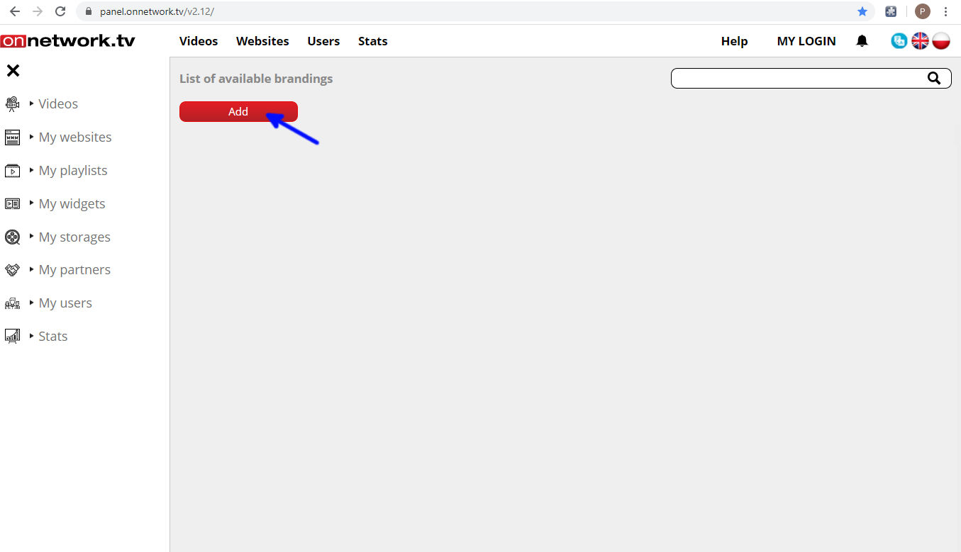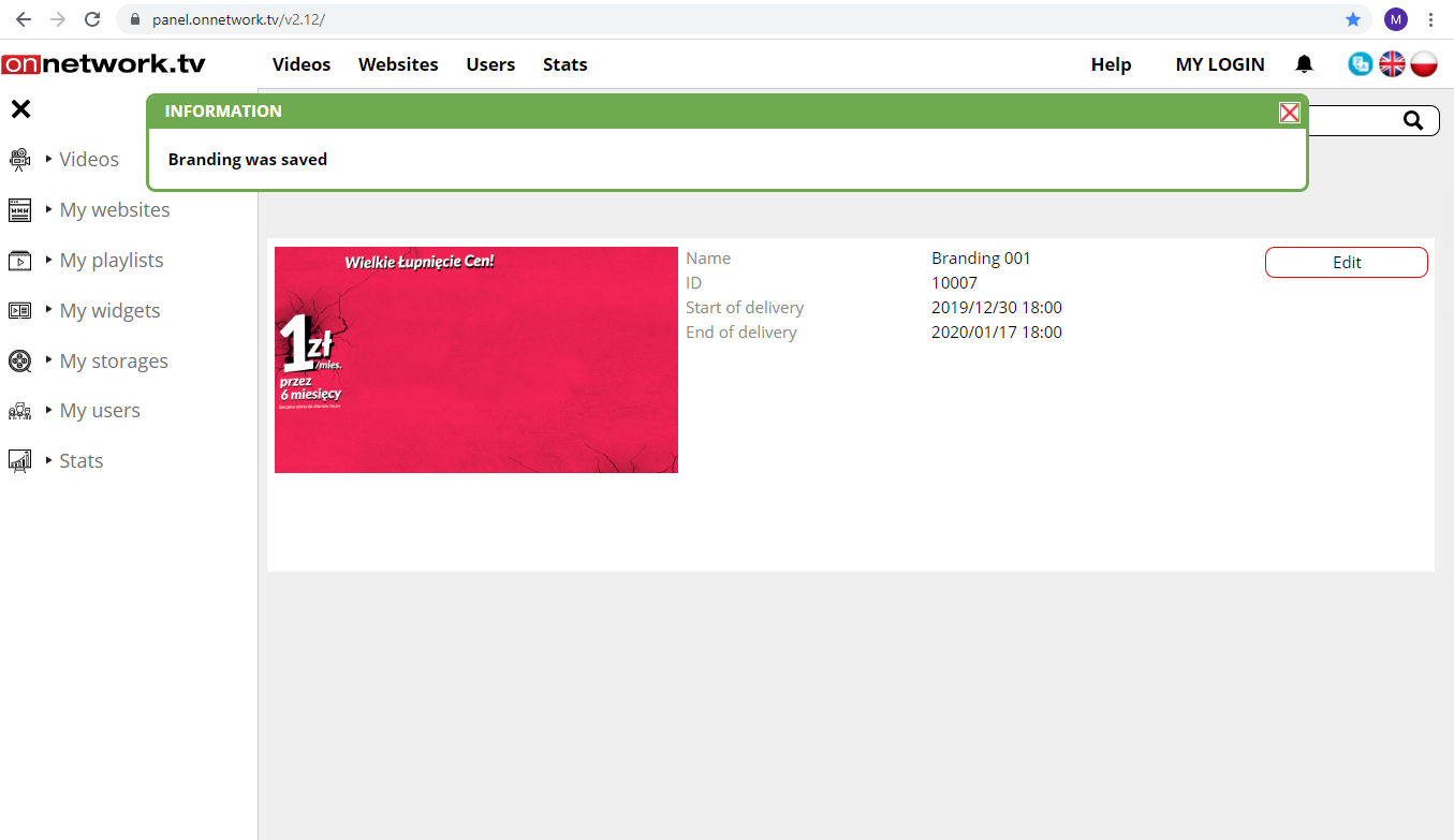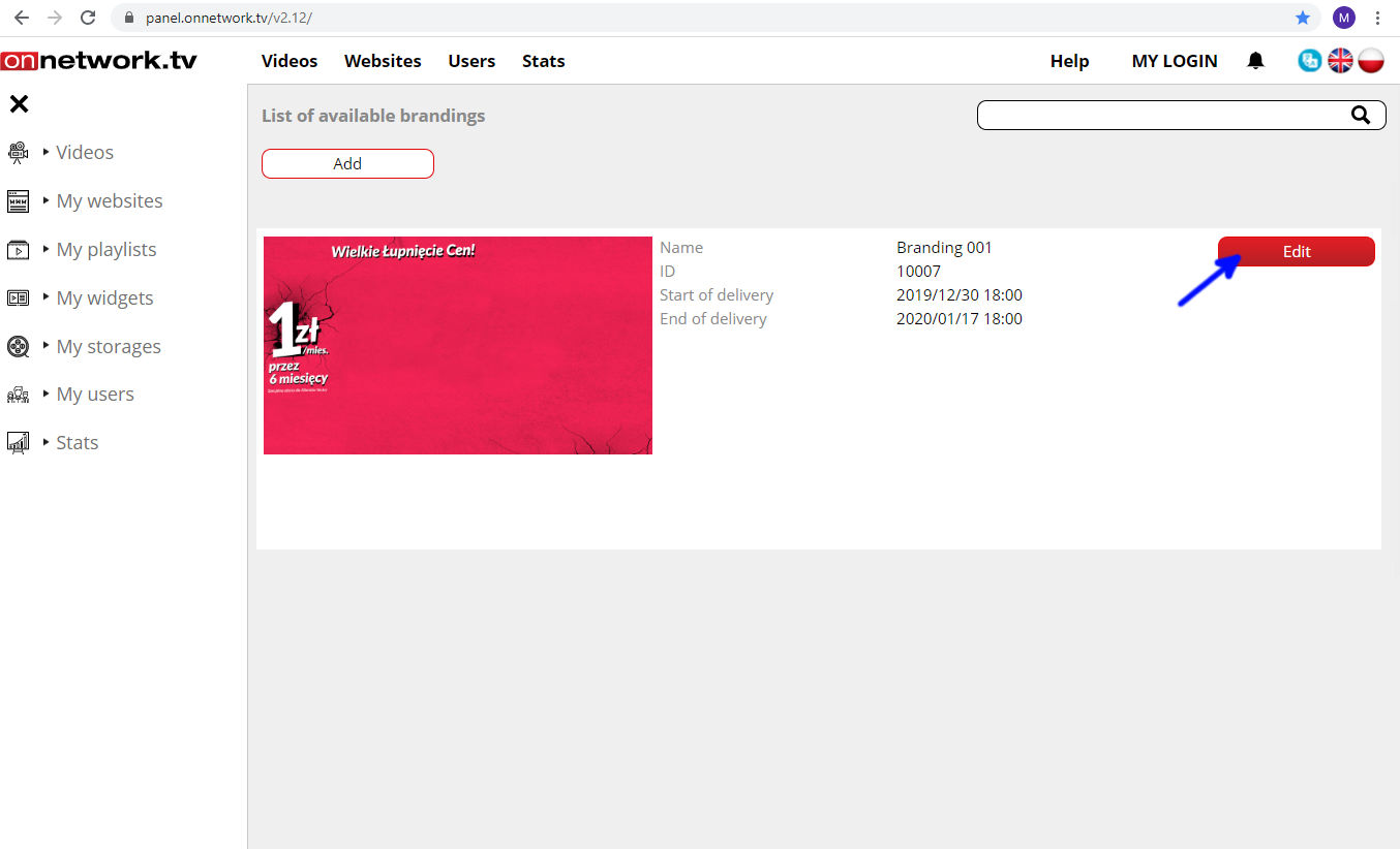 List of own materials will be displayed. Choose material to show branding ad with and click Edit (blue arrow):