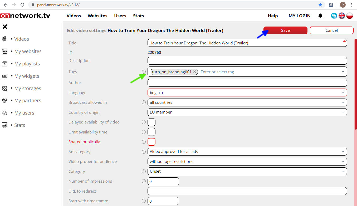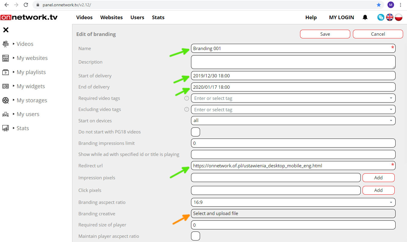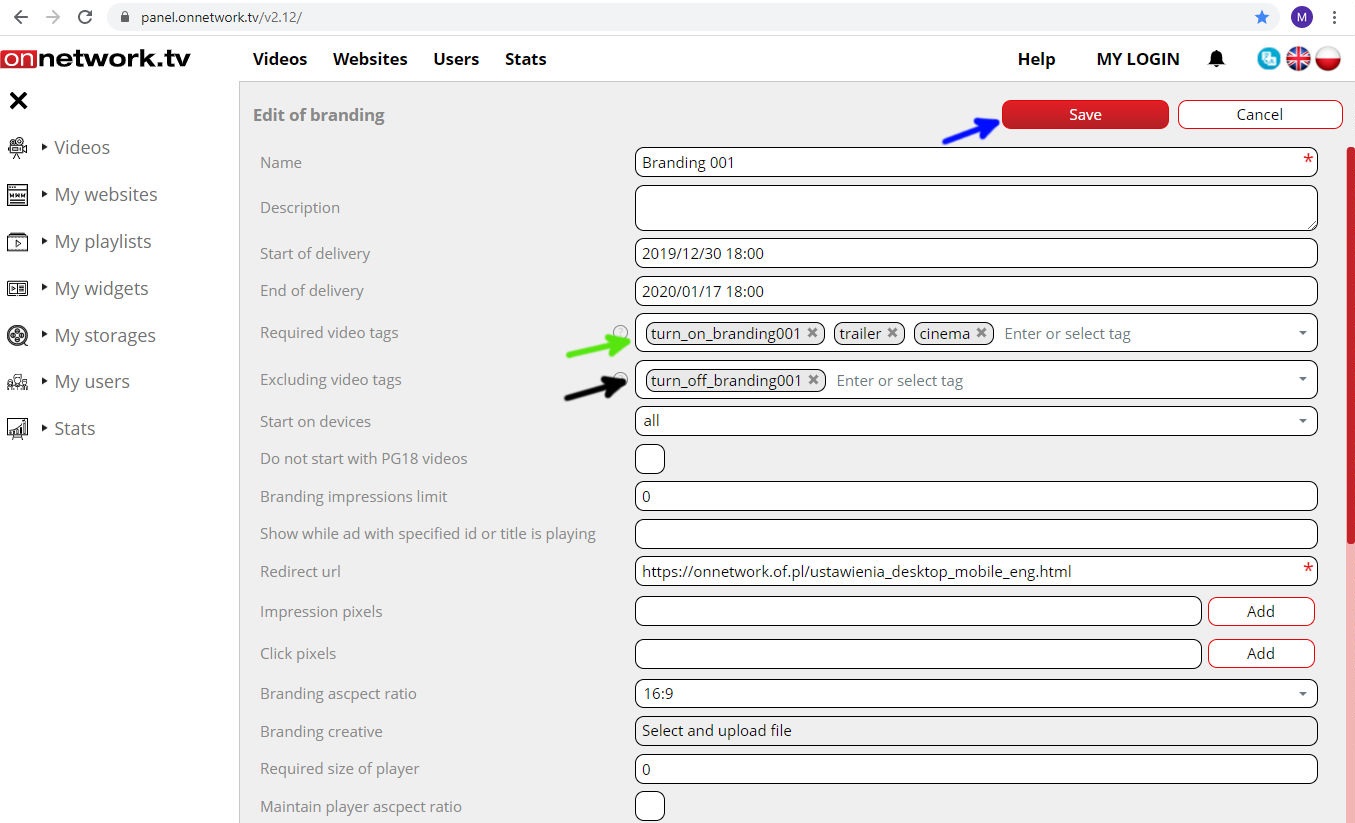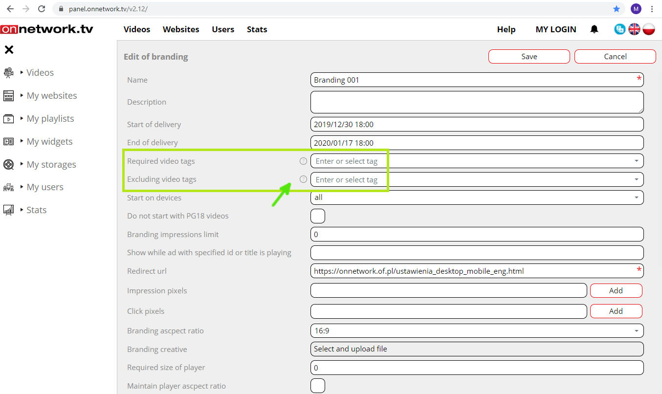 In the field marked with green arrow define tags (that are defined with video materials) that will trigger launching branding.