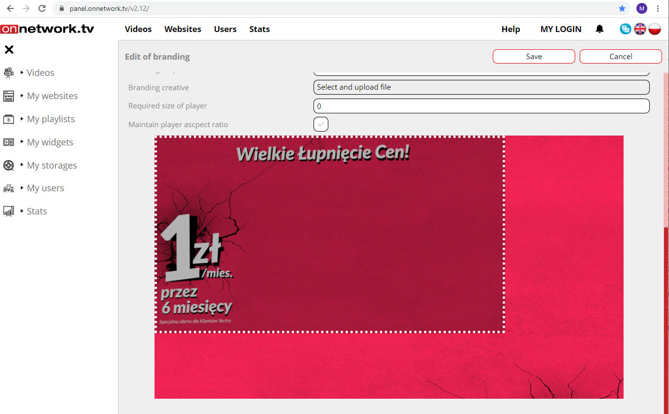 Branding is the new form of ad available in the player. It is graphical element located around the player. This ad is clickable with possibility of defining the landing page.