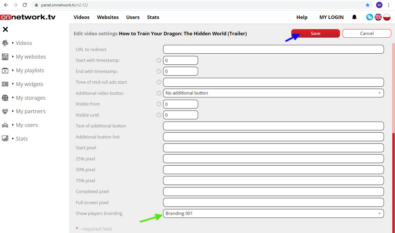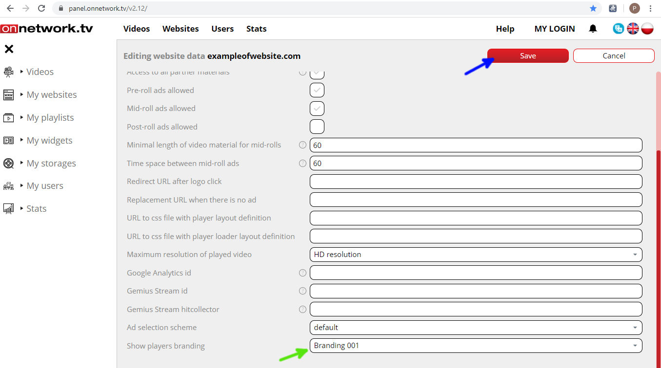 Choose branding on green marked field and Save (blue arrow):
